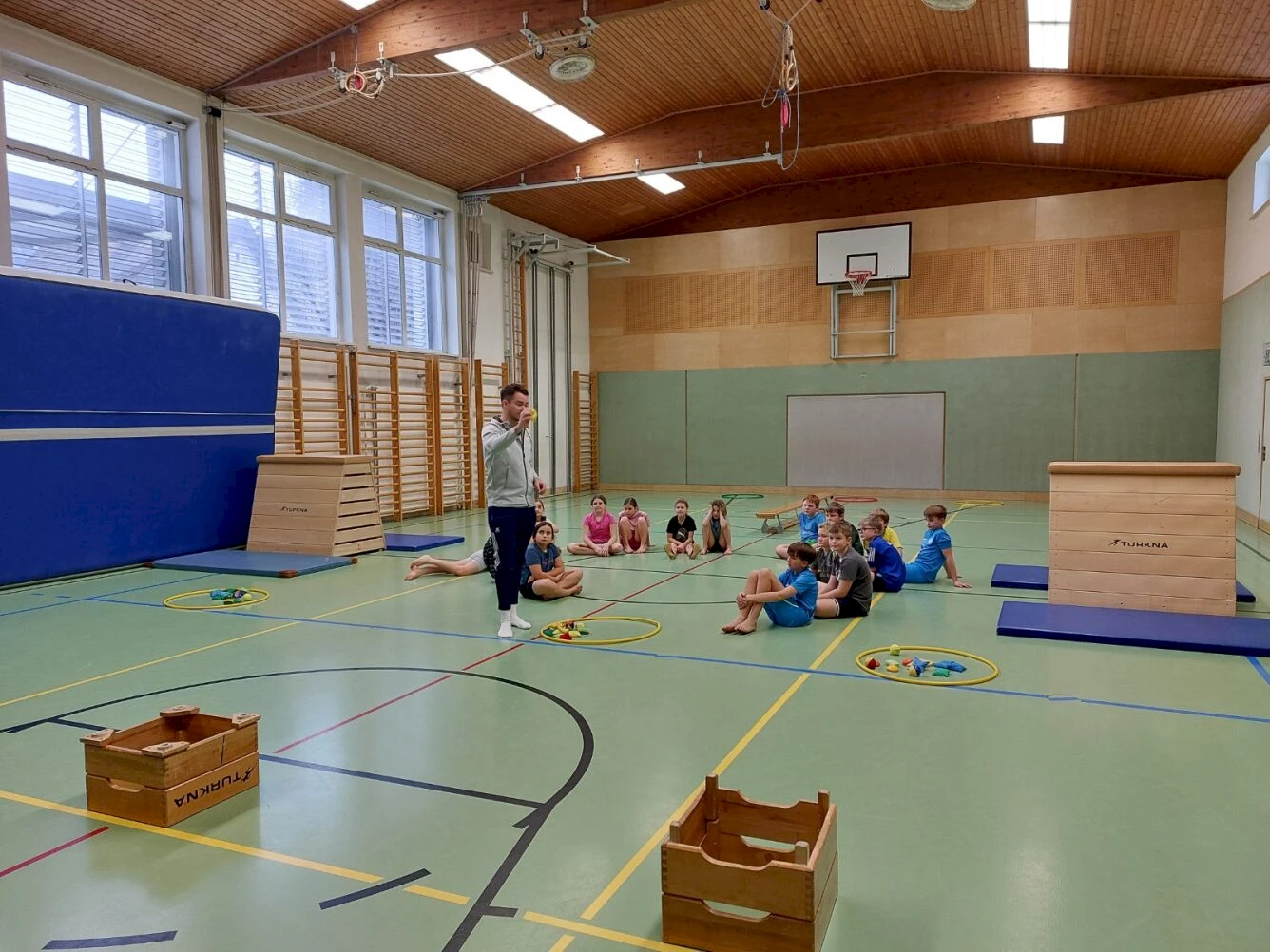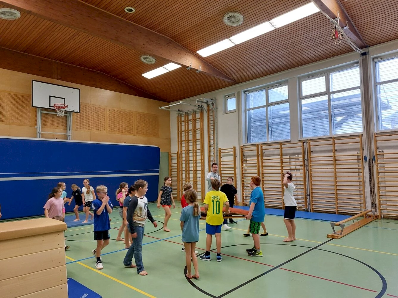 Im Rahmen des Projekts „Bewegte Klasse“ verbrachten die 3. und 4. Klassen am Dienstag zwei aktive Stunden in der Turnhalle. Aufwärmen, Parcours und Werfübungen förderten Geschick und Ausdauer. Zum Abschluss stärkten soziale Spiele Zusammenarbeit und Teamgeist.